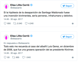 «Si la hipótesis de la desaparición de Santiago Maldonado fuese una invención kirchnerista, sería perverso, infrahumano y delictivo«, lanzó «Lilita» a través de su cuenta de Twitter.