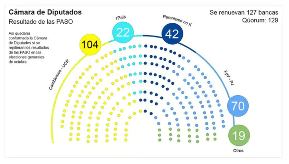 En Diputados hoy Cambiemos tiene 86 bancas y pone en juego 40. Con los porcentajes obtenidos en todo el país, alcanzaría los 58 escaños, lo que lo dejaría con un bloque de 104 diputados, 18 más que los actuales.