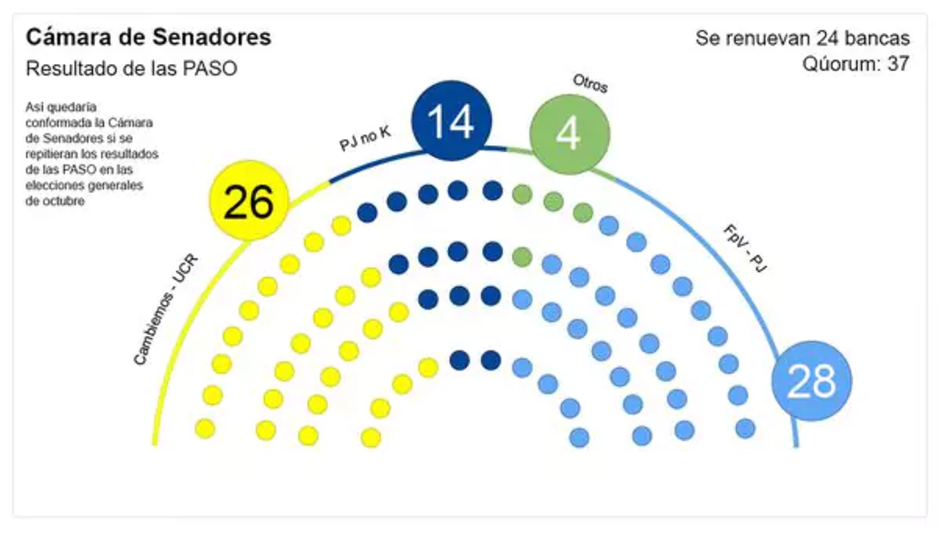 En lo que respecta al Senado el Gobierno recibió una de las mejores noticias. Durante los primeros dos años de su gobierno la Cámara alta fue el bastión fuerte del peronismo, que con 38 senadores tuvo quórum propio (37). Pero ahora, con lo que sería una gran elección de Cambiemos en todo el país, conseguiría aumentar su presencia de 17 a 26 senadores y el FpV-PJ que comanda Pichetto se reduciría a 28.