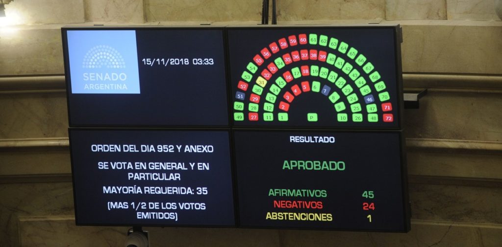 Gracias al apoyo de una parte del peronismo, Cambiemos obtuvo 45 votos a favor de la iniciativa, 24 en contra y una abstención.