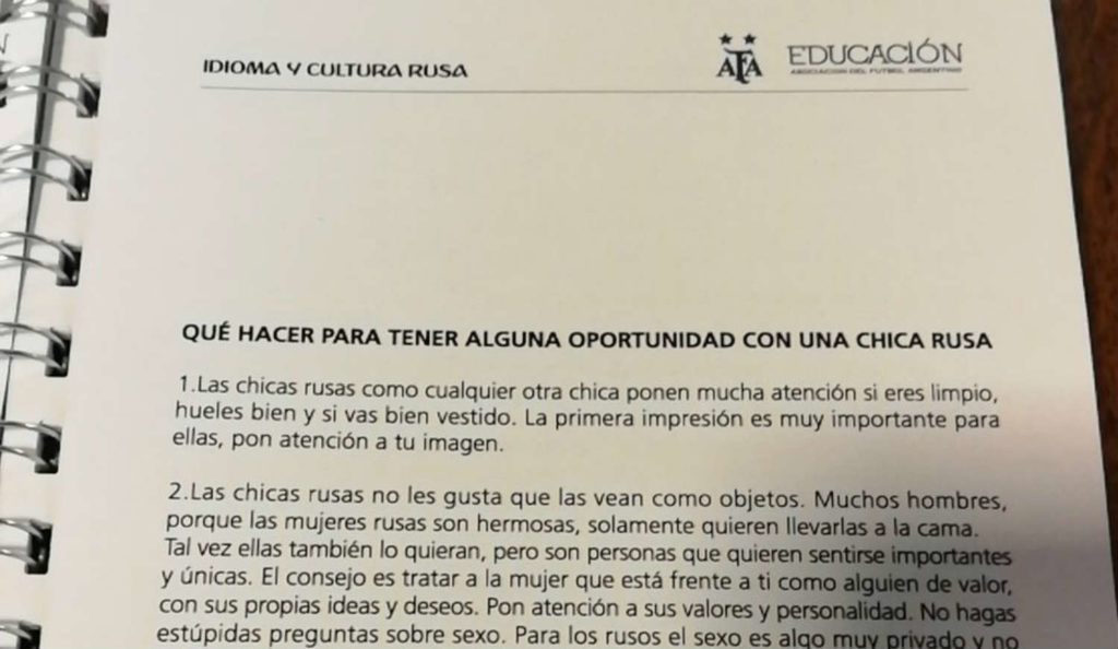 La AFA ofreció un curso a aquellos periodistas que iban a viajar a Rusia para la Copa del Mundo y en uno de los ítems del cuadernillo entregado figuraba un capítulo sobre “Idioma y Cultura rusa” donde explicaban “qué hacer para tener alguna oportunidad con una chica rusa”.