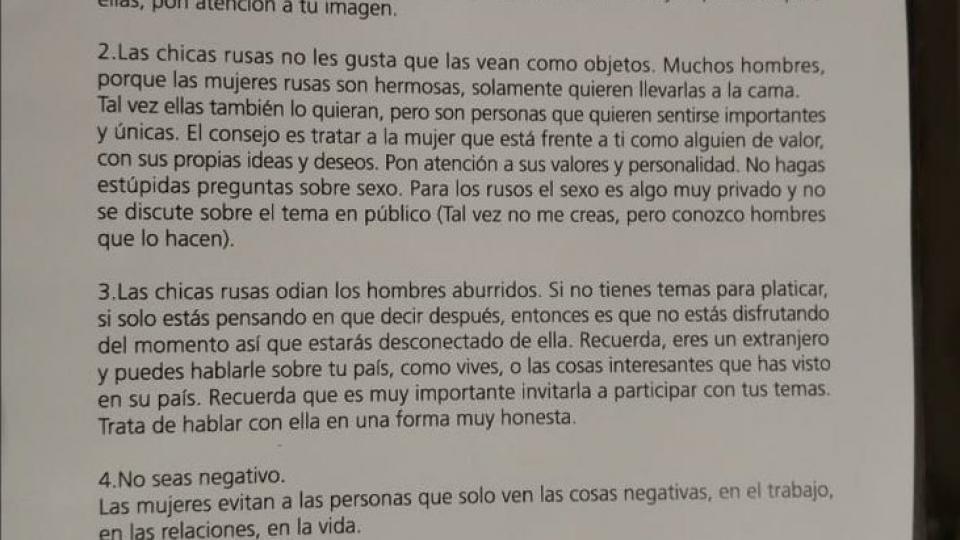 El interventor del organismo investiga el documento "para conquistar chicas" en Rusia, algo que calificó de "estigmatizante y discriminador".
