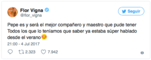 Con esta noticia confirmada, Vigna dejó en claro que entre ella y Pedro no hay ningún conflicto.  «Pepe es y será el mejor compañero y maestro que pude tener. Todos los que lo teníamos que saber ya estaba súper hablado desde el verano», sostuvo en un tuit.