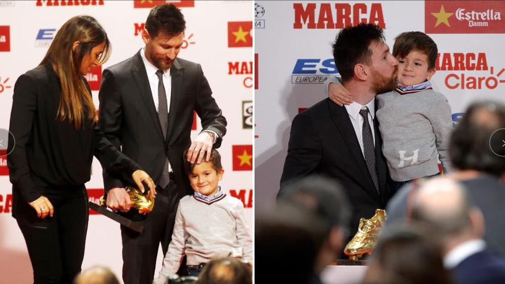 El delantero del Barcelona estuvo acompañado por su mujer, Antonela Roccuzzo; su hijo mayo, Thiago; y su compañero, el uruguayo Luis Suárez, quién le entregó el premio.