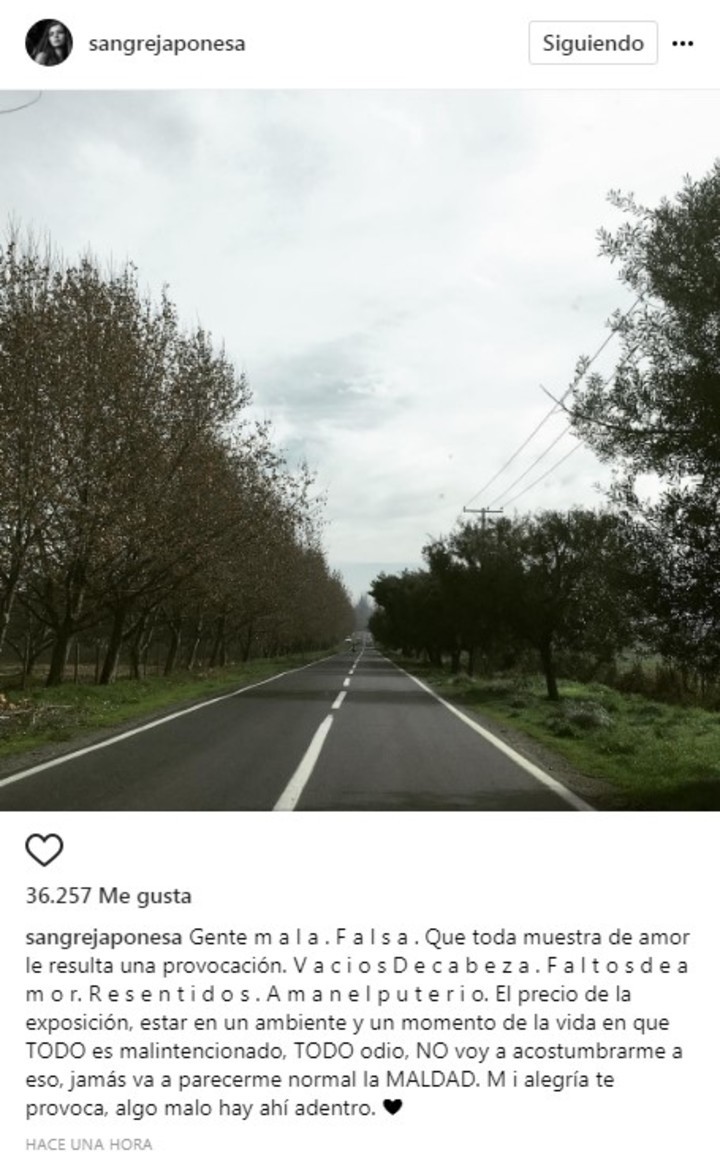 «Gente mala. Falsa. Que toda muestra de amor le resulta una provocación», narra el posteo junto a una imagen de una ruta, que tuvo unos 50 mil «me gusta» en 3 horas.