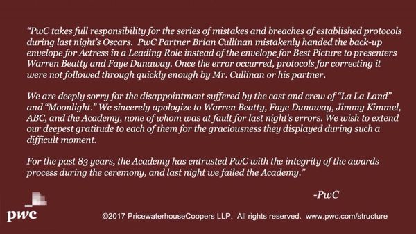 «PwC asume la total responsabilidad de la serie de errores y ruptura de los protocolos establecidos durante la noche de los Oscars. El socio de PwC Brian Cullinan erróneamente les entregó el sobre de ‘Mejor Actriz Protagónica’ en lugar del sobre ‘Mejor Película’ a los presentadores Warren Beatty y Faye Dunaway. Una vez que ocurrió el error, los protocolos para corregirlo no fueron seguidos con suficiente rapidez por el Sr. Cullinan ni por su compañera.