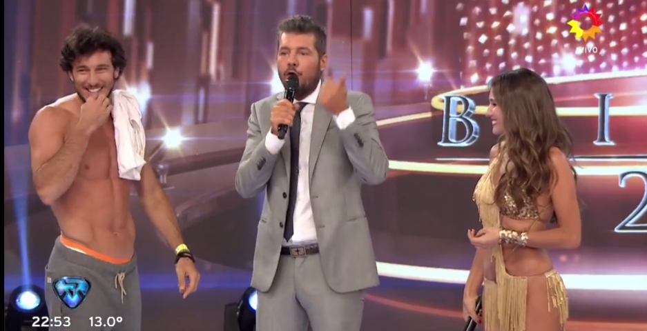 Antes de que su novia entrara en acción, el ex tenista bromeó con Marcelo Tinelli al llevarle un jamón de España como regalo de viaje y luego, ya con Pampita en la pista, accedió a hacer gala de su físico ante los pedidos del conductor. «Sacate mi amor, sacate, ese cuerpo hay que compartirlo», le pidió su novia.