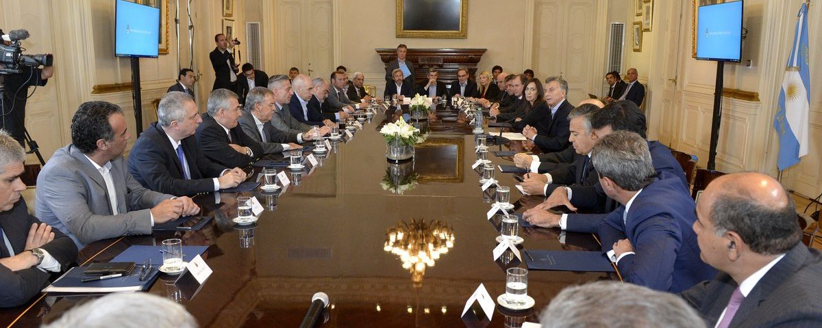 Antes de firmar el nuevo pacto fiscal con los gobernadores, Macri puso de relieve que en este acuerdo coexiste un «acuerdo fiscal», un compromiso de «sancionar la ley de responsabilidad fiscal» y otro para «recibir inversiones y obras, pero todo eso bajando impuestos».