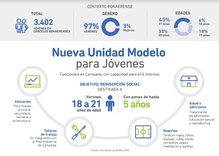 La Unidad Modelo para Jóvenes de Campana –que quedará finalizada en diciembre próximo- alojará a 616 jóvenes de 18 a 21 años, de sexo masculino, que estén cumpliendo una pena menor a los cinco años de reclusión, relacionada con delitos como robos, hurtos o encubrimientos.